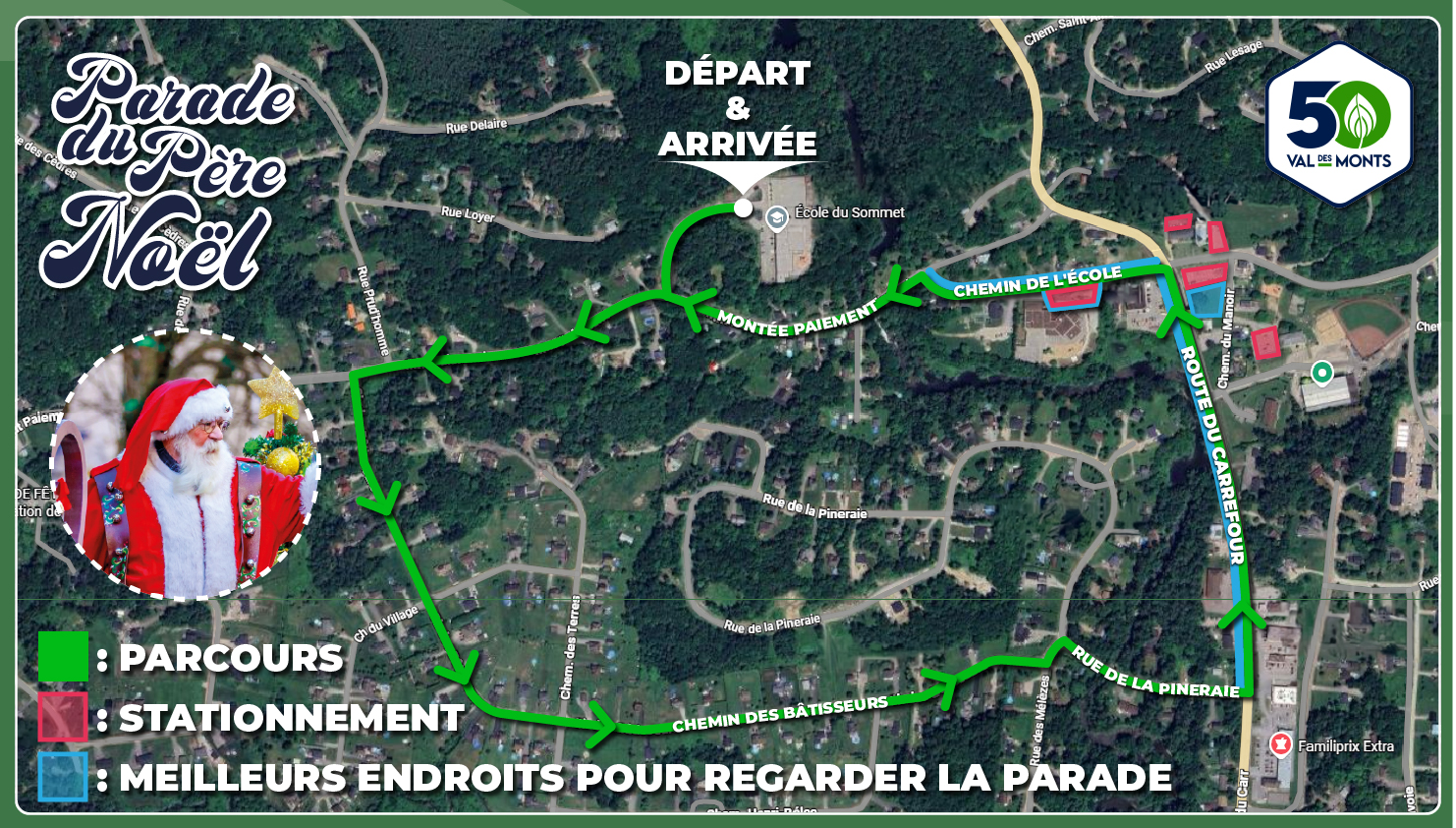 Petits et grands auront les yeux illuminés devant la parade! Distribution de cannes de bonbon, présence du père Noël, lutins, personnages animés et musique festive : tout sera réuni pour répandre la magie des Fêtes et terminer en beauté les célébrations du 50e anniversaire.