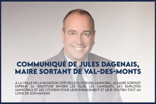 Val-des-Monts – 6 novembre 2025 – Alors que mon mandat touche à sa fin, je tiens à vous informer que je demeure en poste jusqu’à l’assermentation officielle du nouveau conseil municipal, prévue demain.